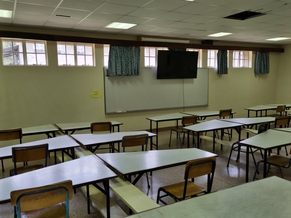 The classroom was previously used for Computer Science, so has large desks connected by wooden platforms which were used to house tower computers.