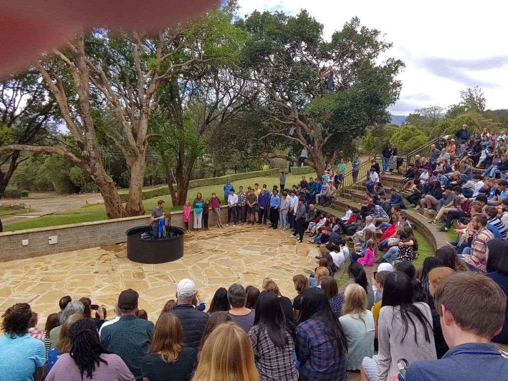 Then on Sunday there was a special baptism service, with several children being baptised in the amphitheatre. Note the pupils hanging from the trees to get a good view.