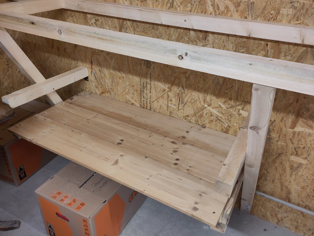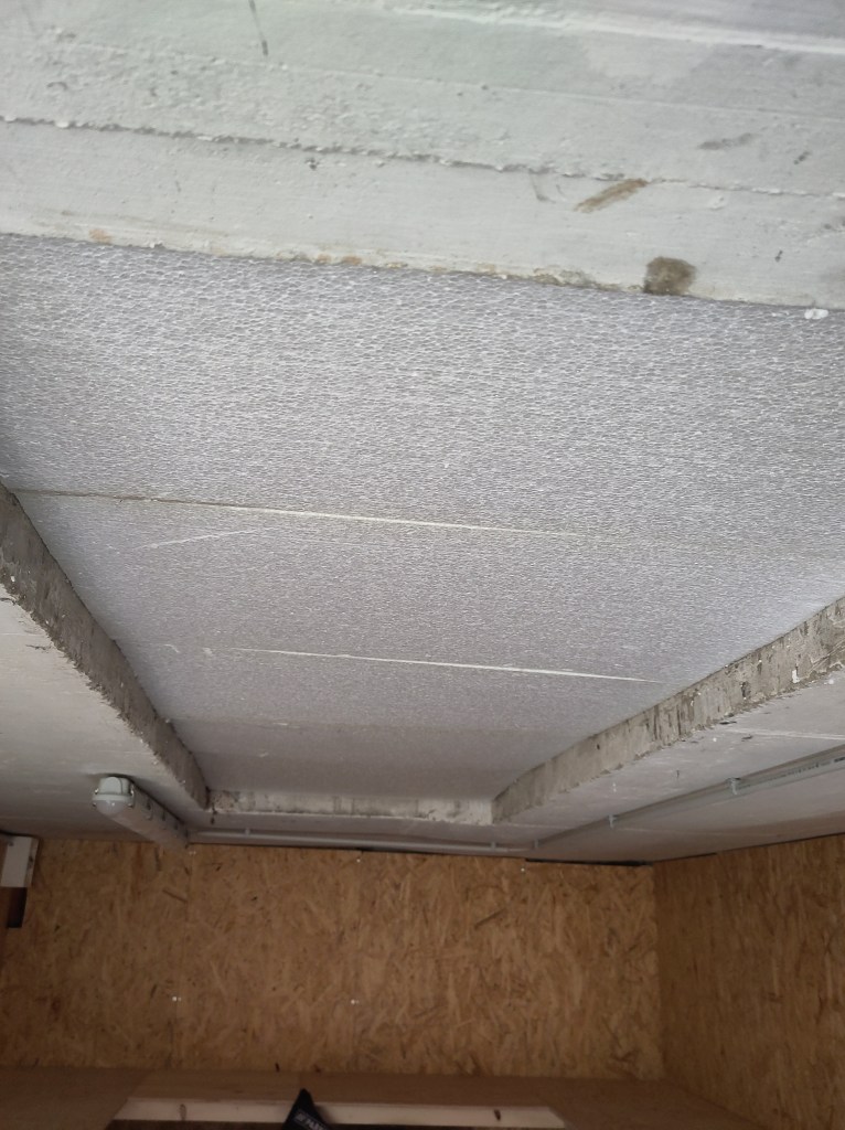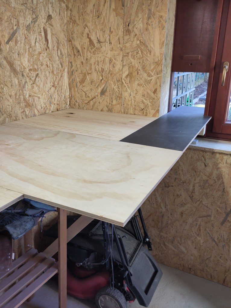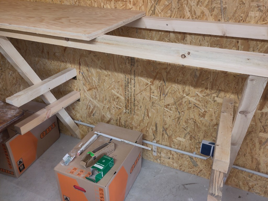 Peter came down again, and we managed (after 3 hours working) to get one set of storage shelves up. Here you can see the shelf supports (as is the trend with this project, substantial and not going anywhere).