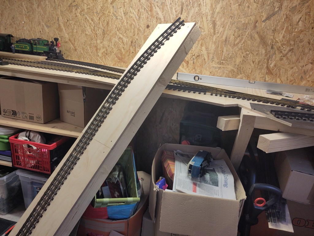 But recently a family was visiting us, and their son in particular is very keen on G-gauge railways. So we were running a passenger train and a good train. As the goods train came through the hatch from the garden and round the curve onto the bridge …. DISASTER! It derailed, and shot over the edge of the baseboard!