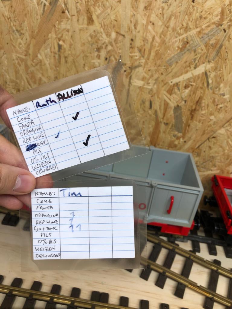 The train also provided a drinks service. Orders were placed via small cards which were placed in the trucks: