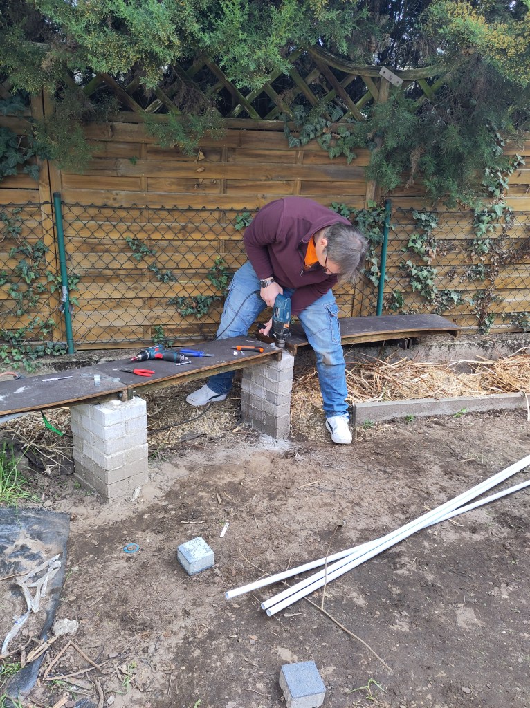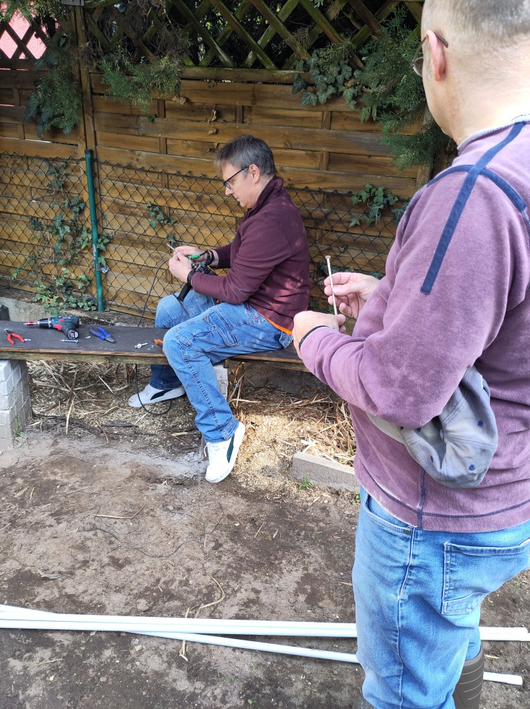 It was decided that the baseboards needed to be screwed to the pillars, for better robustness. Here you can see Arek, preparing the drill, and Tom supervising.