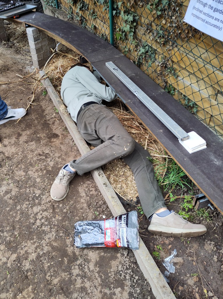 At some points, access was tricky. Although I think here Peter is actually bolting the end of the baseboards together, for added robustness.